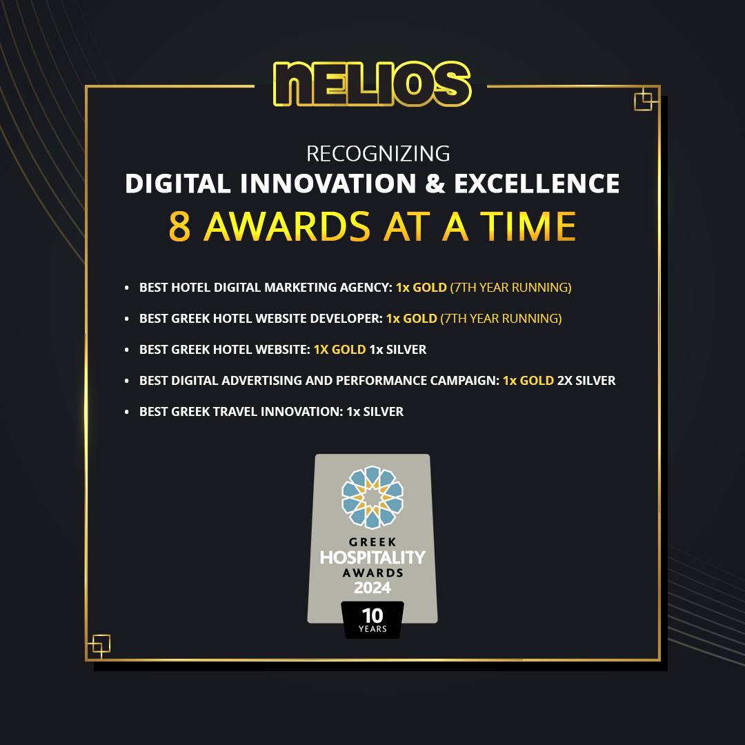 Με σημαντικές βραβεύσεις στο ενεργητικό της, η Nelios είναι το πλέον επιτυχημένο Digital Marketing Agency στην Ελλάδα με ειδίκευση στην τουριστική βιομηχανία. Όραμά μας είναι η μετεξέλιξη / μετασχηματισμός του τρόπου με τον οποίο τα ξενοδοχειακά brands και οι προορισμοί συνδέονται, αλληλεπιδρούν και εν τέλει προσφέρουν αξία στους επισκέπτες τους, στις ομάδες που τα στελεχώνουν και στις τοπικές κοινωνίες στις οποίες δραστηριοποιούνται. Για την Nelios, η τεχνολογία είναι ταυτόχρονα η κινητήριος δύναμη και το κλειδί για τη δημιουργία νέων επιχειρηματικών μοντέλων των επιχειρήσεων που περιλαμβάνονται στο portfolio της, αυξάνοντας σημαντικά την κερδοφορία τους και υποστηρίζοντας παράλληλα τη βιώσιμη ανάπτυξή τους. Με μια ματιά, οι υπηρεσίες που προσφέρει είναι Digital Marketing, Digital Transformation, Σχεδιασμός & Κατασκευή Website, Στρατηγική Branding και Παραγωγή Περιεχομένου.